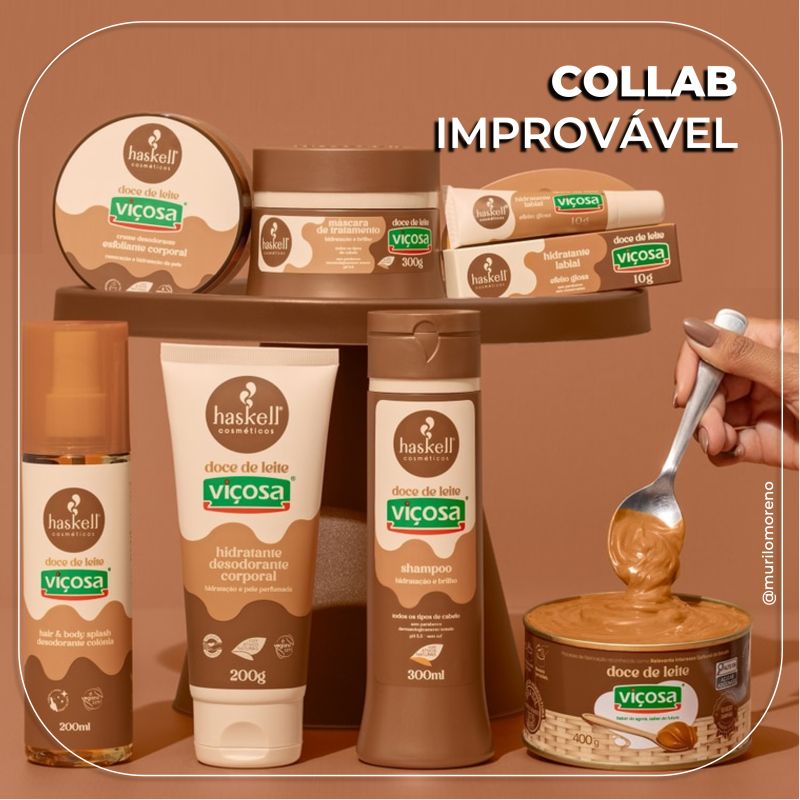 O principal objetivo de uma collab é ampliar a visibilidade das marcas, trocando públicos que não têm em comum. Nisso, o casamento Haskell/Viçosa é perfeito. Até existem pontos de vendas que comercializam os dois, mas normalmente você não encontra doce de leite numa loja de cosméticos, nem um shampoo na prateleira de doces.