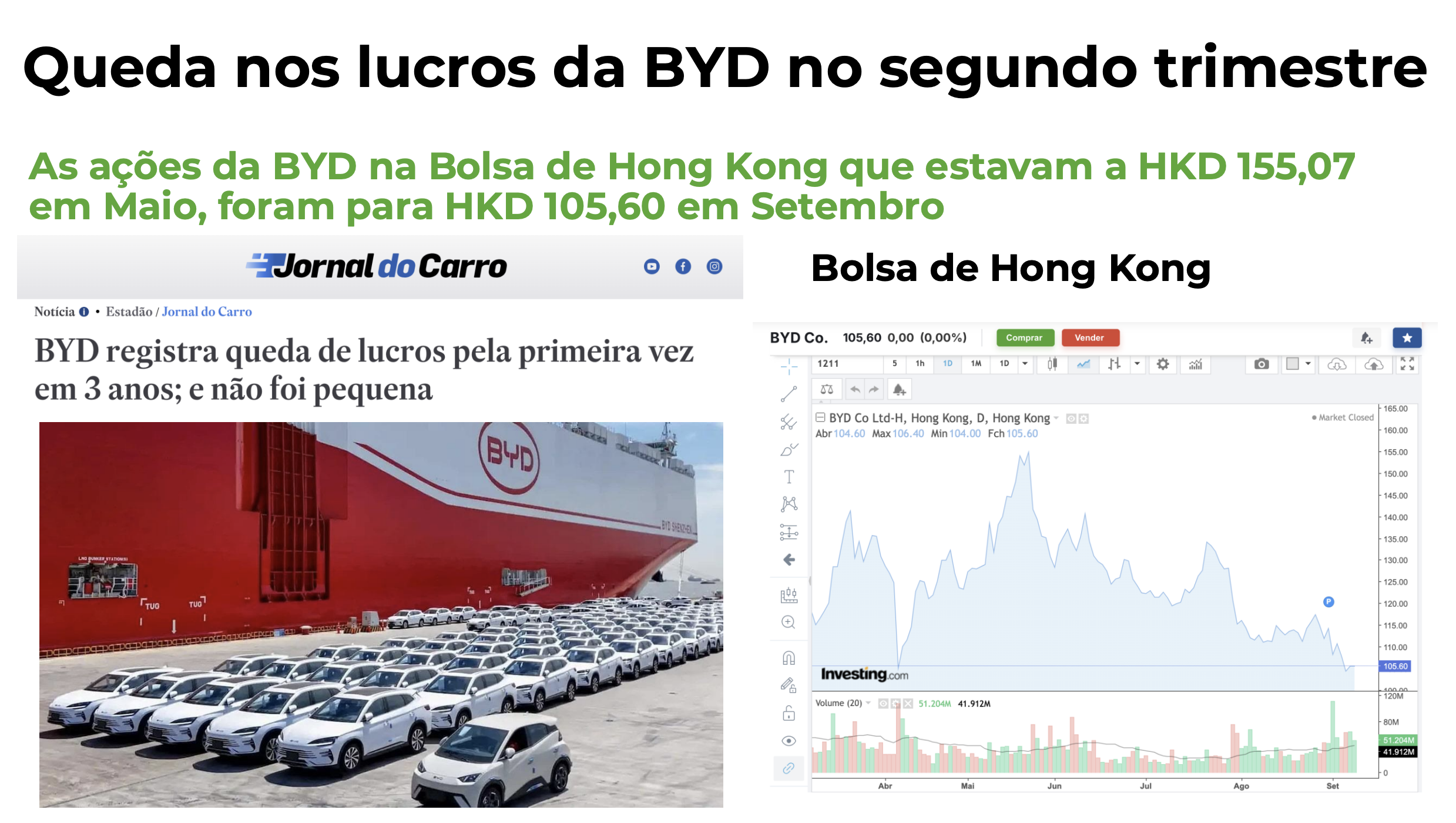 Só como um exemplo, a meta da BYD este ano era vender 5,5 milhões de unidades. Infelizmente, a tendência para o ano é uma queda de cerca de 20% versus a meta.
