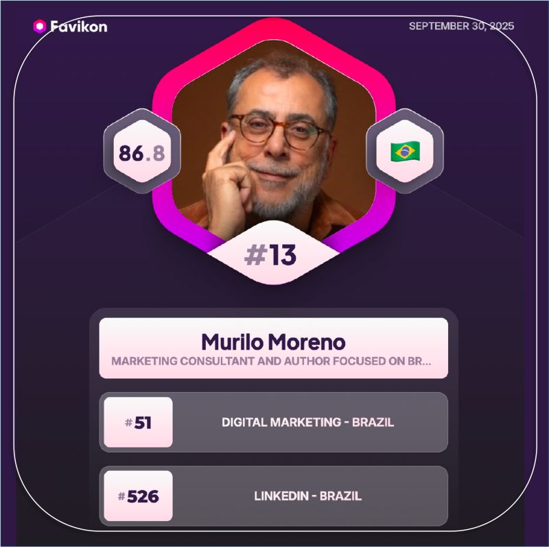 A Favikon é uma agência de influencers que usa a IA para indicar soluções na área. Tem uma metodologia que compara os engajamentos e resultados de cada um que publica posts nas redes sociais e as posiciona conforme seus critérios. No filtro deles, sou o 51o mais influente na área, quando se somam os resultados de Instagram e Youtube, com os números do LinkedIn. Fico feliz com a notícia.