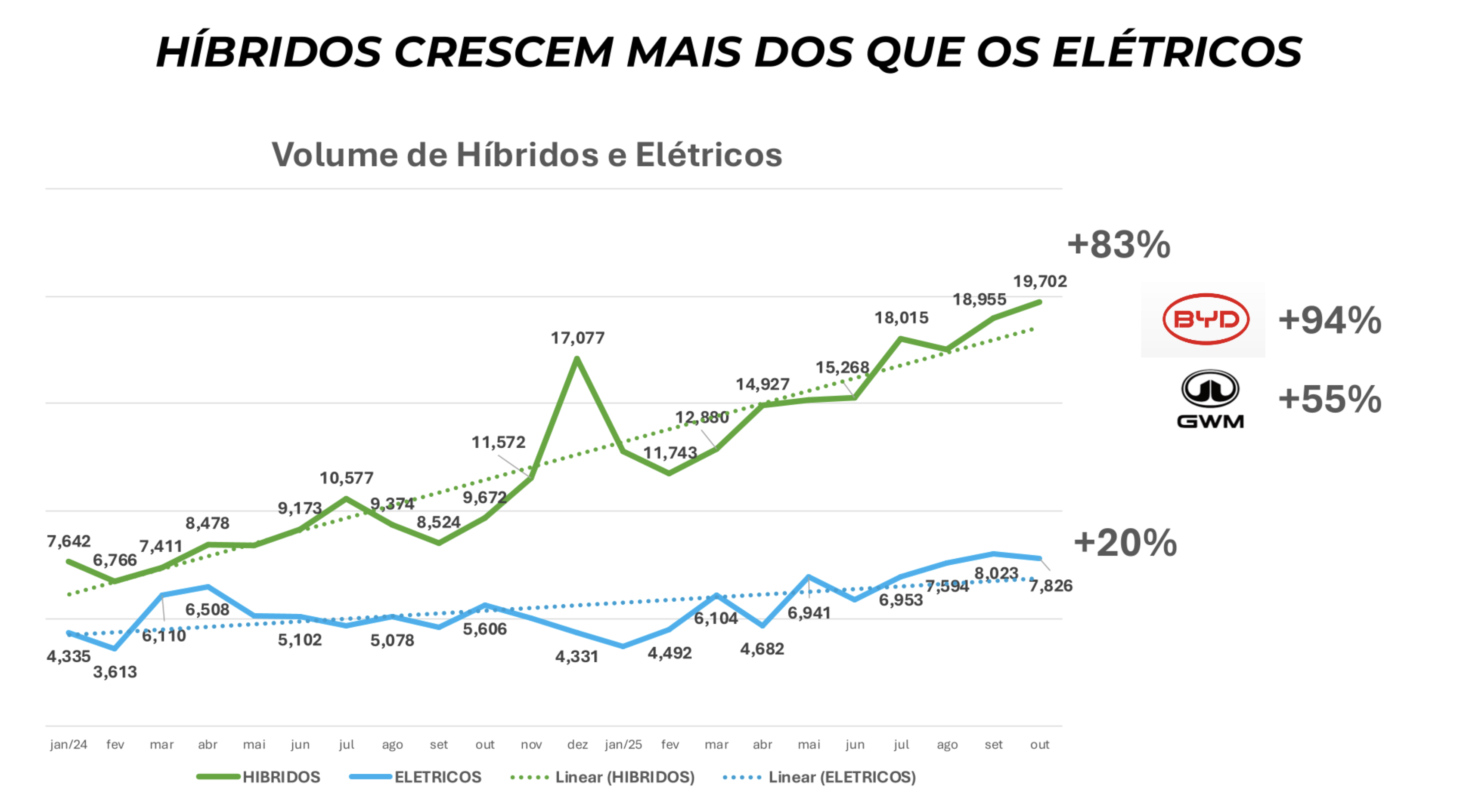 Como tenho comentado, os híbridos tendem a ganhar espaço rapidamente — e os números comprovam essa tendência.