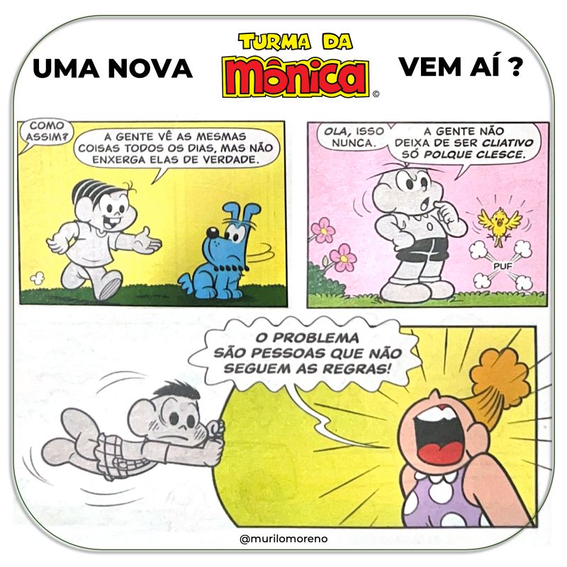 Considerando que o mundo mudou e que a internet e redes sociais tiraram o brilho das revistinhas em quadrinho, a mudança que acontecerá será muito bem-vinda. Mas me impressiona o nível de questionamento pelo qual os personagens da Mônica estão passando. Como velhos chegando perto do fim, todos começam a se analisar, a rever suas escolhas. Diferentemente da vida real, personagens podem se reinventar desde o zero e se adaptar.